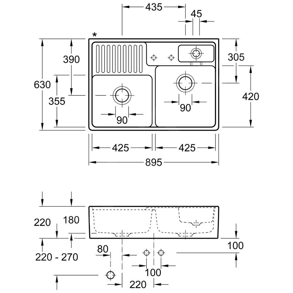 - afmetingen van de spoelbak: 895 × 630 × 220 mm