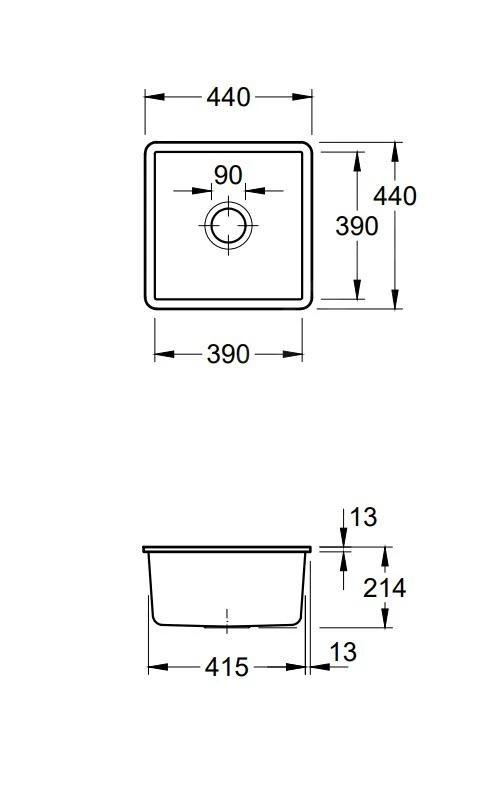 - totale afmeting van de spoelbak: 440 x 440 mm