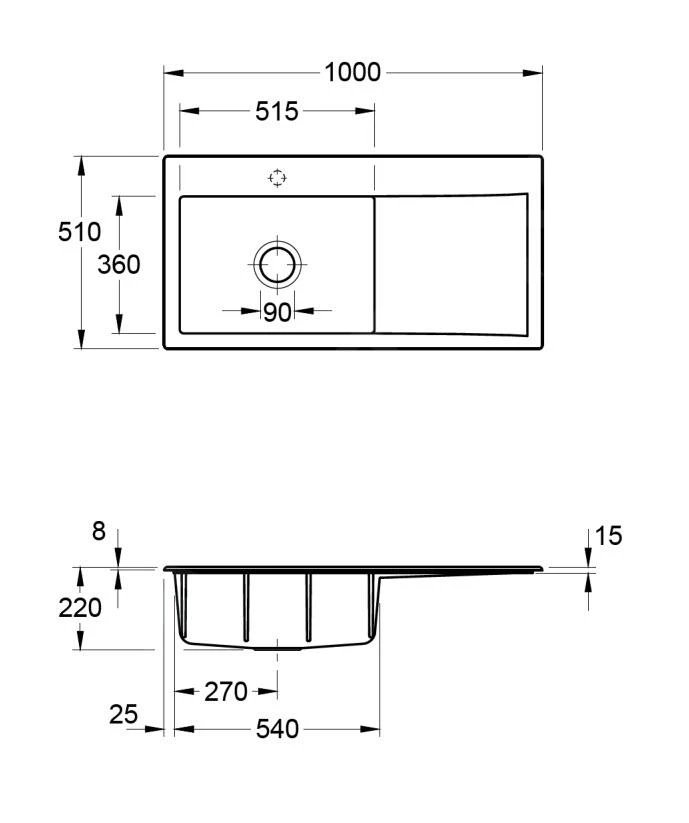 - totale afmeting van de spoelbak: 1000 × 510 mm